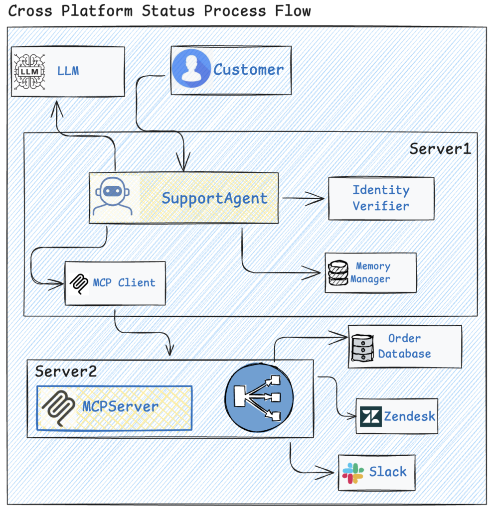 • SupportAgent: The brain of the operation. It processes incoming messages, verifies user identity, retrieves context, and coordinates with the LLM and MCP tools.