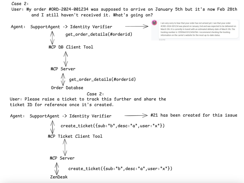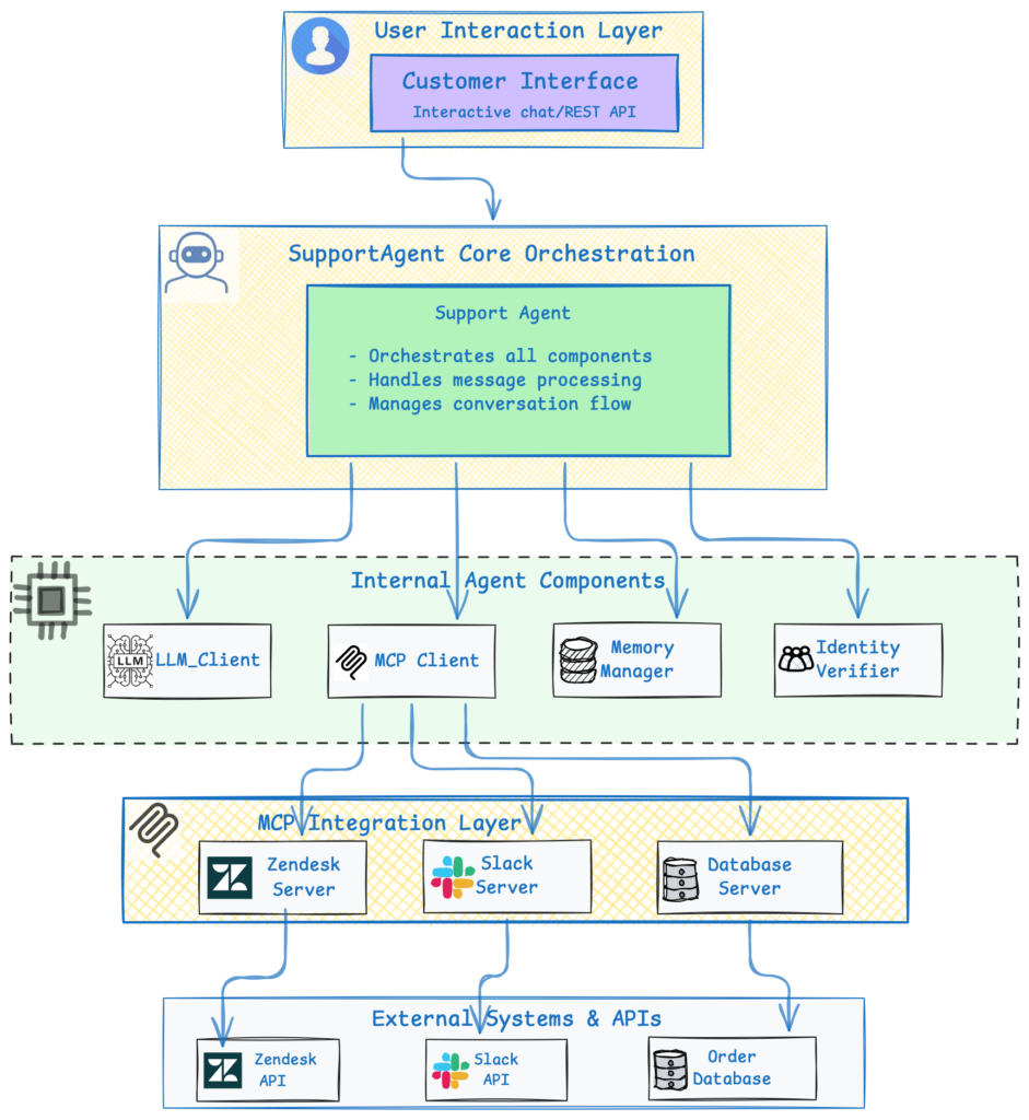 • MCP Client: Discovers and routes calls to MCP servers, which provide tools for integrations like Zendesk (ticket management), Slack (message search), and databases (order queries).